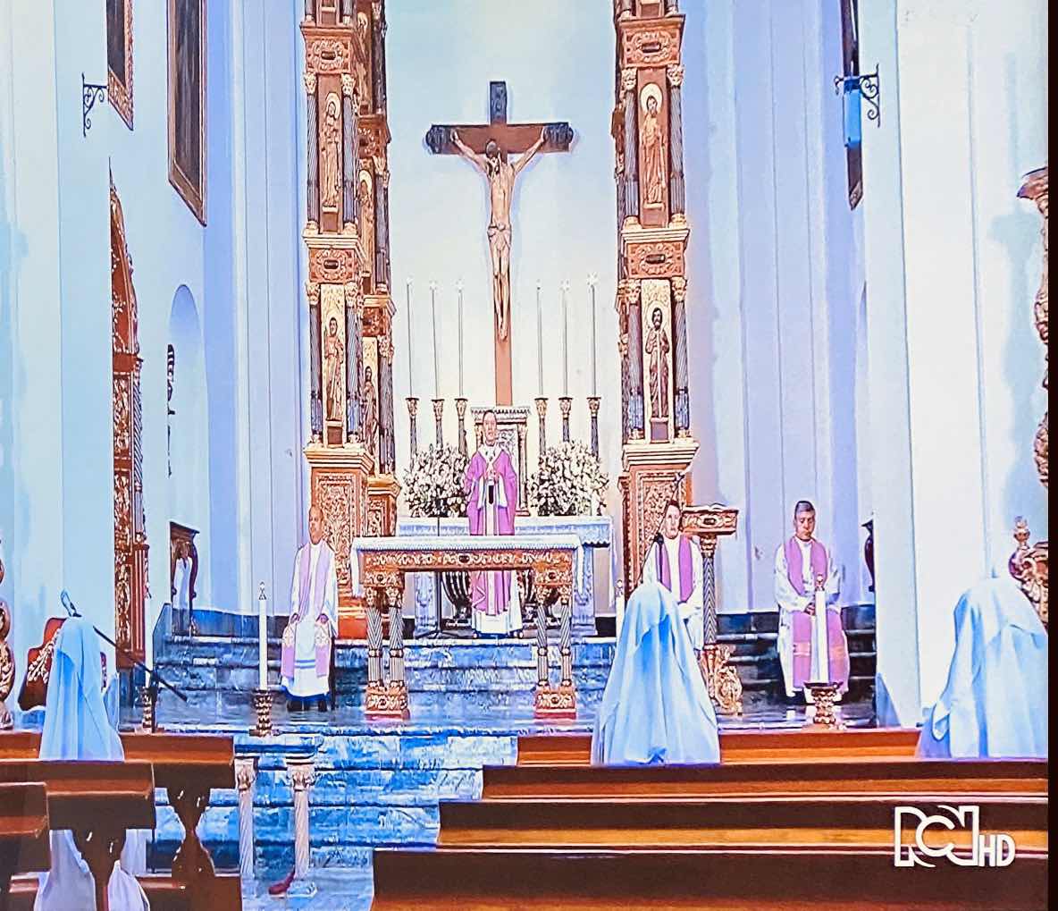 Estamos asistiendo desde nuestra casa a la misa desde la Capilla Anexa a la Catedral de Bogotá, oficiada por el Cardenal Rubén Salazar y transmitida por RCN.