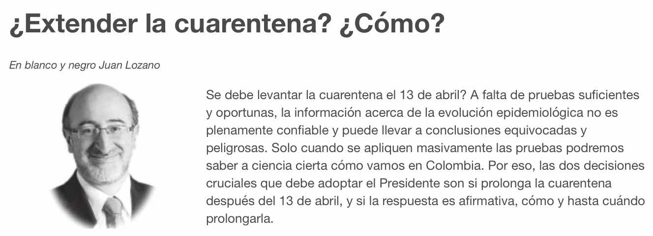 Buena columna de Juan Lozano, en El Tiempo de hoy, proponiendo fórmulas para que la extensión de la cuarentena no nos vaya reventar a todos.